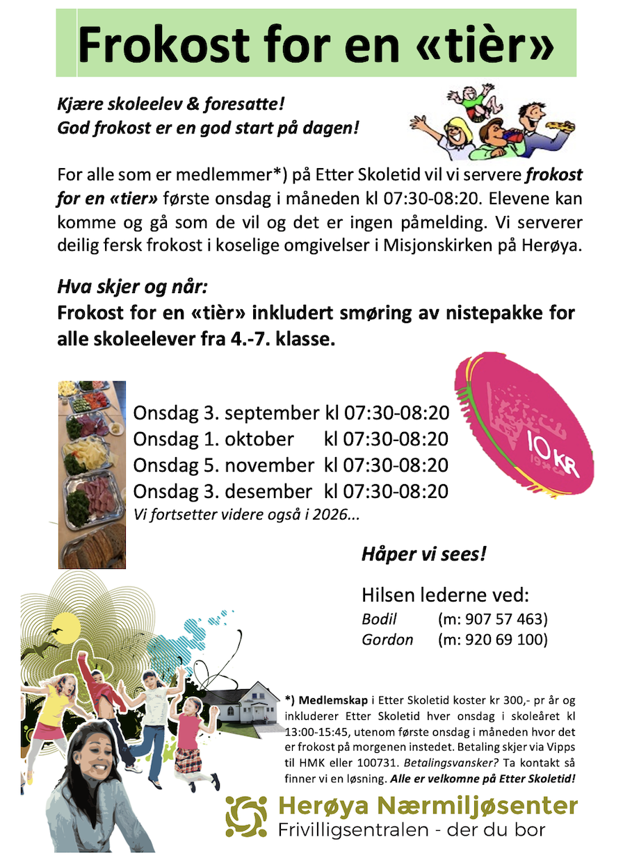 Frokostprosjektet er endelig i gang etter å hatt pause noen år! Her kan elevene fra 4-7. klasse komme og spise god og sunn frokost og smøre nistepakke til skolen!Hjertelig velkommen til en hyggelig frokost her på nærmiljøsenteret. Frokost er dagens viktigste måltid, og en onsdag i måneden kan elevene fra 4-7. klasse komme og spise sunn og god frokost sammen. Nistematen smører de også her! Vi gleder oss til en god start på dagen!